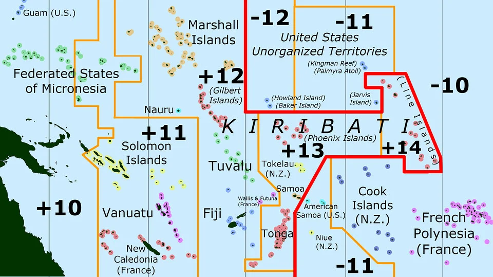 -Mivel valahol meg kellett húzni a Föld dátumválasztó vonalát, ahol elkezdődhet az új nap. A Csendes-óceán logikus pontnak tűnt, hiszen itt nagyon kevés ember él, így itt zavar a legkevesebb vizet, ha meghúzzuk azt a bizonyos dátumválasztót. Na persze a kis szigetlakókat erről elfelejtették megkérdezni. Kiribati szigeteinek egy része sokáig angol, míg a másik amerikai gyarmat volt. Mivel épp itt húzódott a dátumválasztó, a szigetek egyik fele ide, a másik a túloldalra esett. Miután Kiribati függetlenné vált, ez elég problémás helyzetet eredményezett, nagyjából olyan volt, mintha a Dunától nyugatra csütörtök lenne, míg keletre mindig eggyel hátrébb járnának. Ezért Kiribati egységesen átlépett a keletre eső időzónába, így minden új nap itt kezdődik először el először.